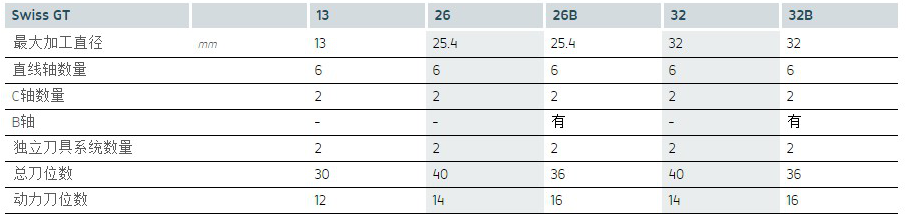 Swiss GT 26 和Swiss GT 32 可安裝高達40把刀具,包括14把動力刀,而Swiss GT 13 可配備多達30把刀具,包含12把動力刀。Y軸大幅提高了背軸加工的能力,無需二次加工即可完成某些復雜工件的生 產。