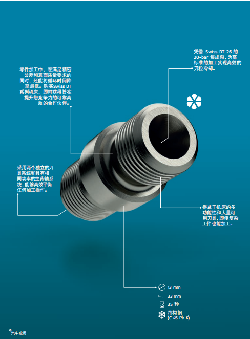 Swiss DT 系列瑞士型車床專業(yè)設(shè)計滿足典型長 短車削工件的各種要求。該系列機床簡單易 用,加工直徑達 13 和 25.4 mm,可顯著提高生 產(chǎn)效率。Swiss DT 系列采用先進的技術(shù)和高效的五軸運動結(jié)構(gòu),是所有車削和銑削加工的理想之選。
